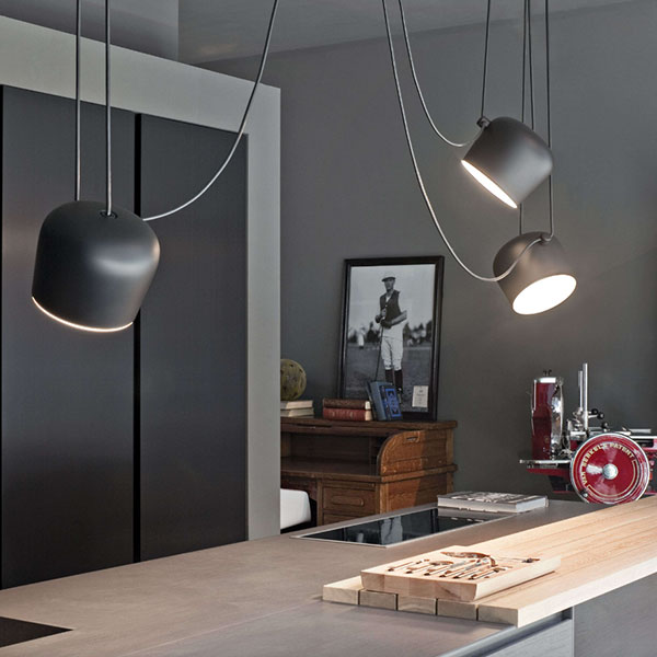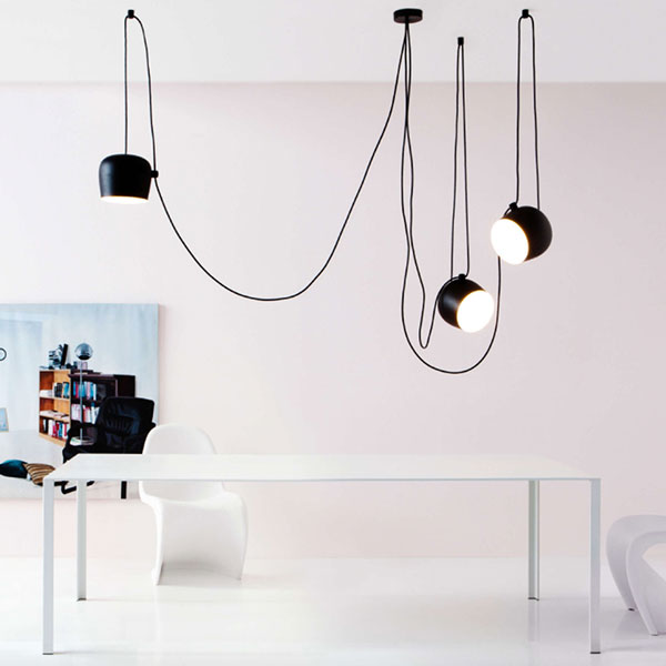 Apparecchio di illuminazione a sospensione. Corpo in alluminio tornito in lastra verniciato a liquido, diffusore in policarbonato ottico fotoinciso. Riflettore interno in ABS fotoinciso. Corpo orientabile. Alimentazione da rete. Il Led può essere dimmerizzabile con dimmer di tipo «Triac per Led» approvato da Flos. Flos non è responsabile in caso di installazioni in cui il collegamento all’impianto elettrico non sia corretto. La lunghezza del cavo utile è di 9 metri, la lampada può quindi essere sospesa a 3 metri dal soffitto. Disponibile rosone multiplo con possibilità di connettere fino a 5 Aim.