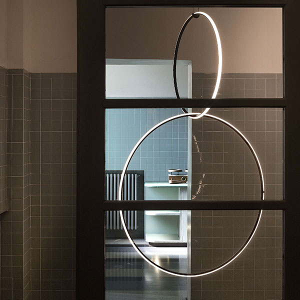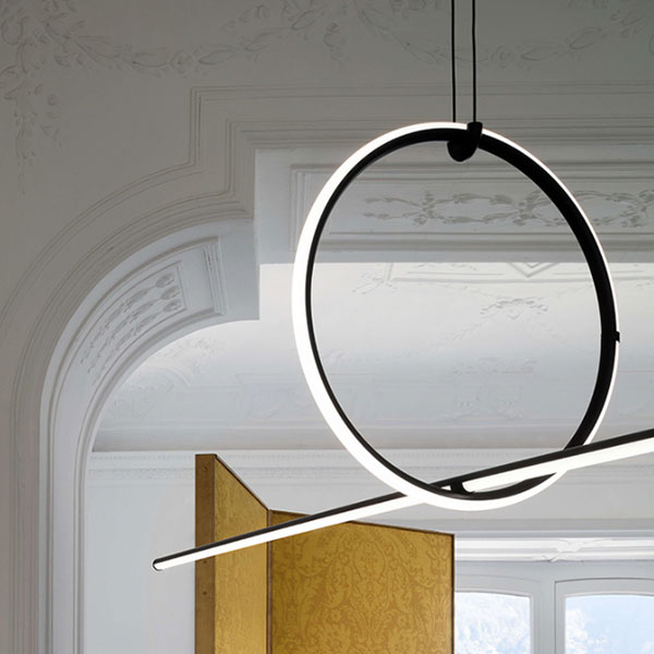 Apparecchio dilluminazione a sospensione, a luce diffusa. Corpo in alluminio estruso, curvato, lavorato a CN e verniciato nero a polvere, diffusore in silicone ottico platinico.Ogni elemento è alimentato grazie a un sistema di connessione elettrica e meccanica, studiato appositamente per consentire configurazioni personalizzate del prodotto.I rosoni sono disponibili in due potenze: per una configurazione della lampada con potenza inferiore a 70W, o inferiore a 190W. Sono disponibili anche rosoni classe III per installazioni con power supply remoto: in versione surface nel caso di installazione su cemento, o recessed per soffitti in cartongesso.Lelettronica integrata nel rosone consente lutilizzo di diversi sistemi di dimerizzazione: push, 1-10, potenziometro, DALI. Nel caso di assenza di questi sistemi si può settare il flusso luminoso in fase di installazione, con sistema push incluso nel rosone.Lunghezza dei cavi: 2,4mt.