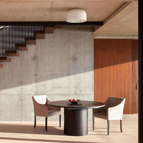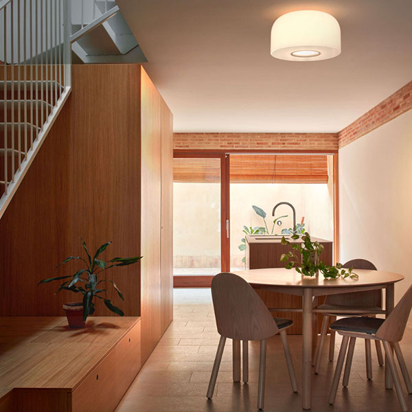 Bellhop Glass Ceiling può essere utilizzata sia come luce d’ambiente che come luce da lavoro. Emette un cono di luce diretta e non abbagliante che illumina con precisione la superficie sottostante. L’apertura inferiore della lampada, protetta da un elemento in alluminio, è progettata per orientare il fascio luminoso e consentire la sostituzione della sorgente senza disperdere la luce negli occhi di chi è seduto al tavolo.Si crea così un cono di luce che si espande uniformemente nell’ambiente e atterra con precisione sul piano, come un fascio concentrato, visivamente evidenziato dall’anello in alluminio colorato che circonda l’apertura inferiore.