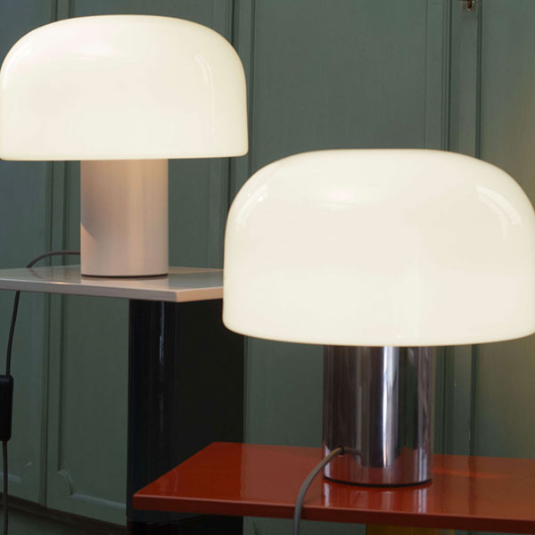 Lampada da tavolo di grandi dimensioni. La cupola è composta da un diffusore in vetro opalino triplex, strutturato in un sandwich di strati di vetro, con lo strato bianco situato tra due strati trasparenti soffiati simultaneamente. Gli spessori variano per ogni strato. Questo design è stato sviluppato in collaborazione con il dipartimento di Ricerca e Sviluppo di Flos. L’uso del vetro opalino triplex e le grandi dimensioni, che mantengono la sorgente luminosa a distanza dalla superficie interna del diffusore, consentono di generare un’illuminazione uniforme, calda e accogliente, creando un’atmosfera piacevole nell’ambiente. Questa versione della lampada Bellhop Glass, con un diametro di 33 cm, si poggia su una base cilindrica in alluminio di 12 cm di diametro ed è disponibile nelle versioni Bright Aluminium, Cioko e White. I materiali si distinguono non solo per il loro valore estetico, ma anche per la loro capacità di riciclo a fine vita, sottolineando l’impegno di Flos per la sostenibilità.