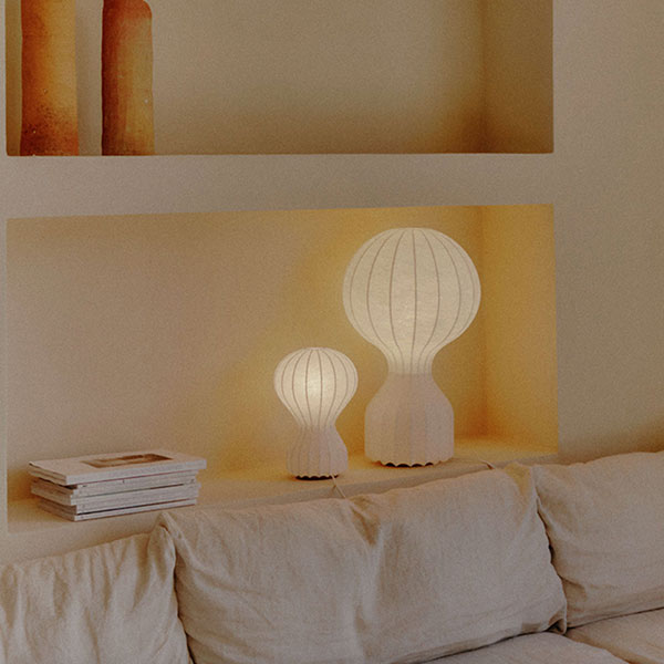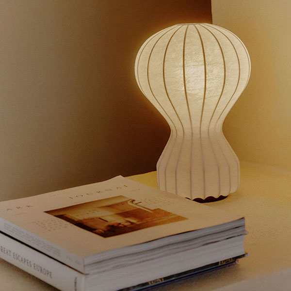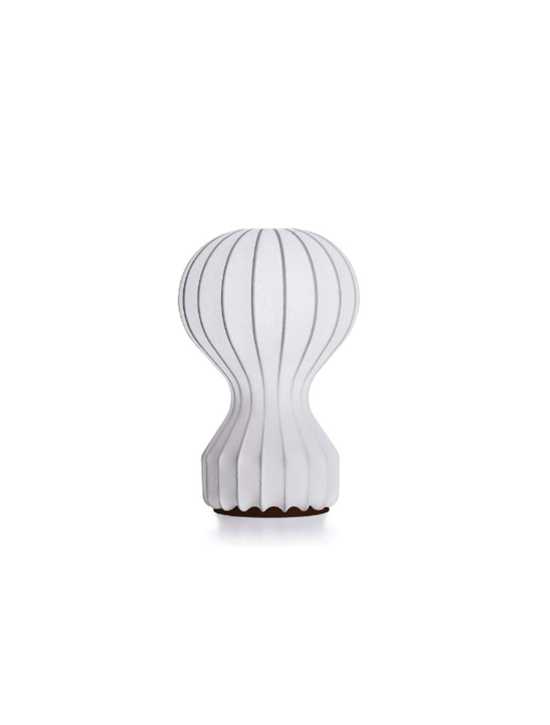 Lampada da tavolo a luce diffusa. Struttura interna in acciaio verniciato a polvere bianco. Diffusore in resina “cocoon” spruzzata sulla struttura, con protezione trasparente, realizzata a spruzzo alla fine della lavorazione. Sul cavo è presente il dimmer elettronico che consente la regolazione a step dell’intensità luminosa.