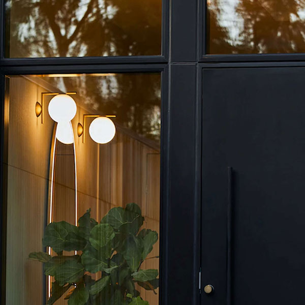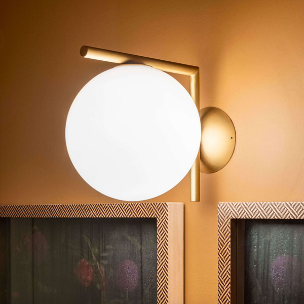 Apparecchio di illuminazione da parete/soffitto a luce diffusa. Telaio in ottone, spazzolato e verniciato trasparente o acciaio cromato. Diffusore opalino di vetro soffiato.