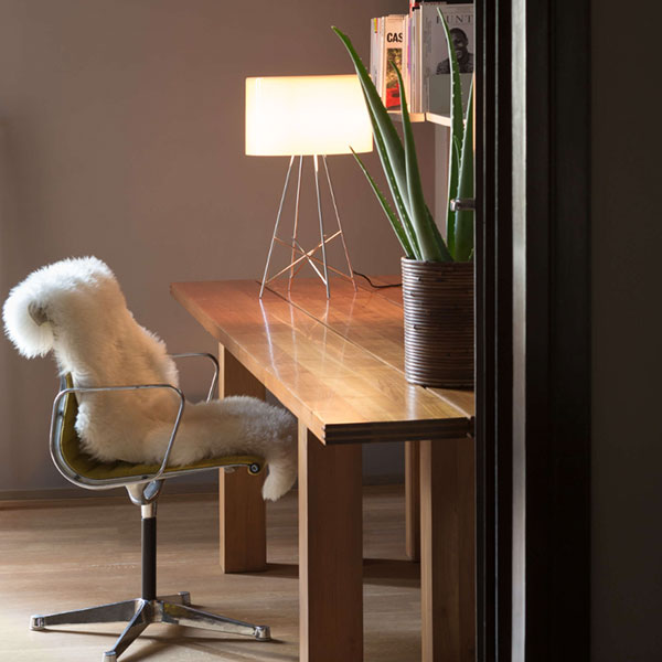 Apparecchio di illuminazione da tavolo a luce diffusa. La struttura di supporto dell’apparecchio è in tubolare di acciaio diametro 10mm saldato, spazzolato e cromato. Disco supporto diffusore in lega di Zama pressofusa lucidata e cromata. Copertura portalampada in PA6 (Nylon) stampato di colore bianco ad iniezione. Diffusore interno in PC (policarbonato) stampato ad iniezione di colore opalino al 3%. Piedini in PVC (polivinilcloruro) elastico stampato ad iniezione trasparente. Diffusori in alluminio torniti in lastra e verniciati all’interno di colore bianco ed esternamente di colore bianco lucido o nero lucido, oppure in vetro grigio incamiciato e soffiato a bocca con finitura esterna lucida. Sul cavo è presente il dimmer elettronico che consente la regolazione a step dell’intensità luminosa.