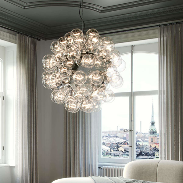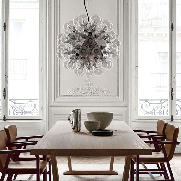 Apparecchio di illuminazione a sospensione a luce diretta e riflessa. Struttura composta da 20 triangoli in alluminio lucidato stampato. 60 lampadine Globolux chiare, alloggiano attorno alla struttura. Attacco a soffitto e rosone di acciaio.