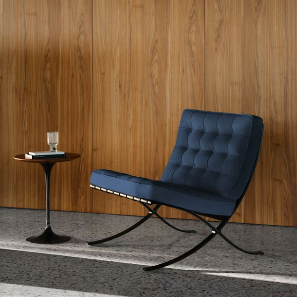 - Di forma architettonica, la seduta inclinata della Barcelona Chair mantiene chi vi si siede in una posizione rilassata ma sostenuta.
