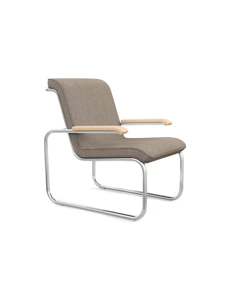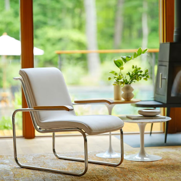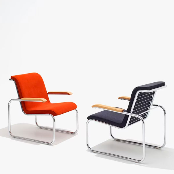 La poltrona MB Lounge fa parte del vasto lavoro di Marcel Breuer che utilizza l’acciaio tubolare, un materiale rivoluzionario nella costruzione di mobili quando fu progettata nel 1929. La struttura apparentemente continua sostiene un cuscino imbottito in schiuma su molle metalliche orizzontali che forniscono un leggero movimento allo schienale.