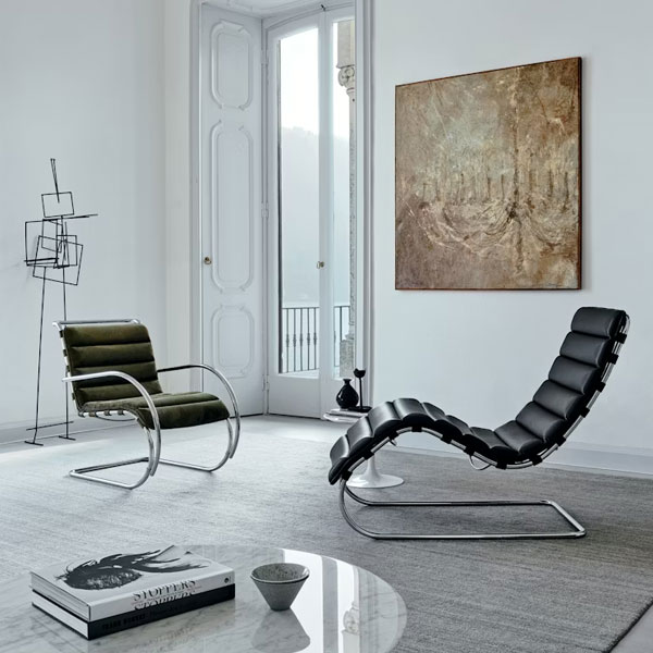 Influenzato dal collega maestro del Bauhaus Marcel Breuer, Ludwig Mies van der Rohe riconobbe rapidamente i pregi dell’acciaio tubolare. Abbinando il materiale moderno alla forma classica delle sedie a dondolo in ferro del XIX secolo, creò la MR Chaise Lounge nel 1927. Con le sue curve aggraziate e la struttura a sbalzo, la chaise assume una forma sorprendente che si flette per supportare comodamente i movimenti di chi vi si siede. Nel 1948, Mies concesse a Knoll i diritti esclusivi per la produzione dei suoi mobili, inclusa la serie MR.
