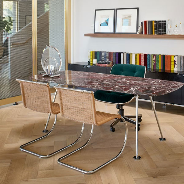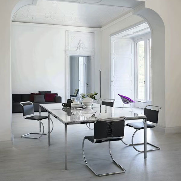 Influenzato dal collega maestro del Bauhaus Marcel Breuer, Ludwig Mies van der Rohe riconobbe rapidamente i pregi dell’acciaio tubolare. Abbinando il materiale moderno alla forma classica delle sedie a dondolo in ferro del XIX secolo, creò la sedia MR nel 1927. Con le sue curve aggraziate e la struttura a sbalzo, la sedia assume una forma sorprendente che si flette per supportare comodamente i movimenti di chi vi si siede. Nel 1948, Mies concesse a Knoll i diritti esclusivi per la produzione dei suoi mobili, inclusa la serie MR.