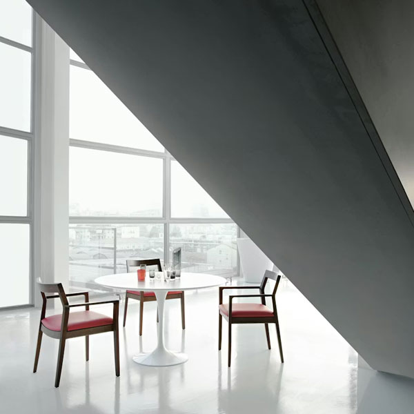 Nel suo approccio purista all’architettura e al design, Eero Saarinen cercò l’idea essenziale e la ridusse alla soluzione strutturale più efficace. Uno degli esempi più emblematici è il design a una gamba della sua collezione Pedestal. Questi pezzi maestosi e disinvolti nascono dal suo desiderio di eliminare la confusione causata dalla “bassa concentrazione di gambe” sotto sedie e tavoli tipici. Il tavolo Pedestal e la sedia Tulip che lo accompagna sono diventati da allora simboli del design moderno di metà secolo e pilastri della tradizione progettuale di Knoll.