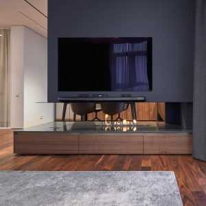 Bruciatore a bioetanolo automatico. Accensione e gestione con telecomando. 4 regolazioni della fiamma. Capacità 4,1 litri; autonomia 5– 7 ore; Potenza massima 5,3 kW