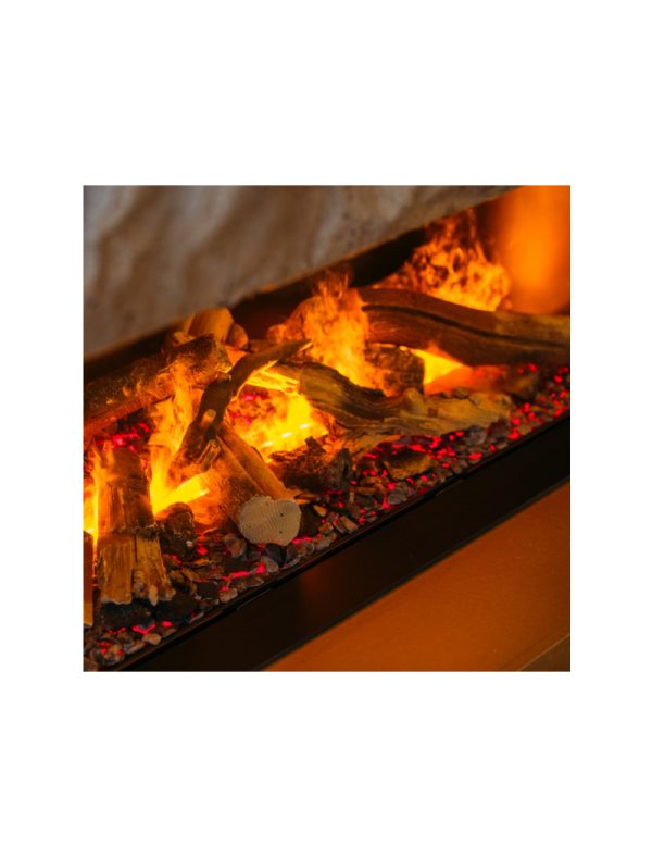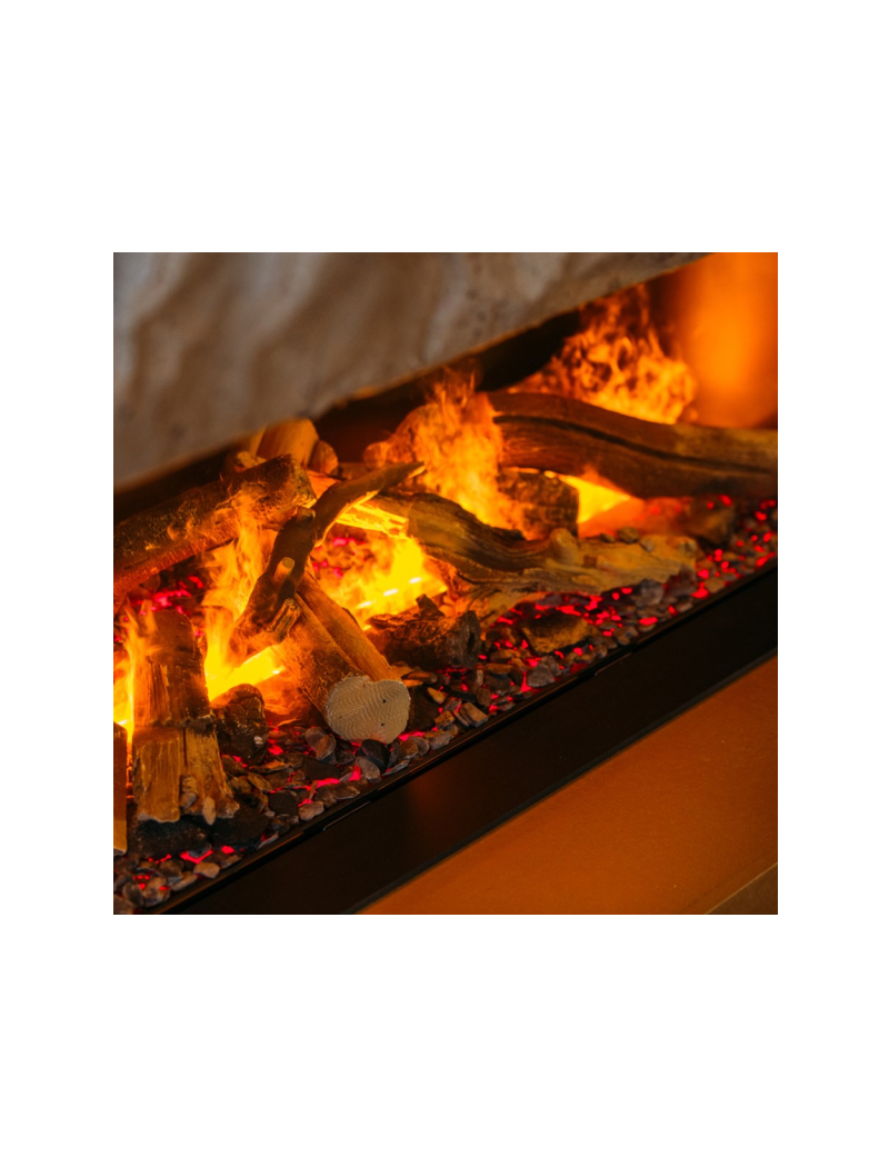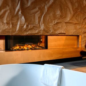 Caminetto 16:9 angolare (dx o sx) elettrico ad acqua, chiuso con vetro, riscaldamento 2 kW, carica acqua automatica (solo con allaccio idraulico), interfaccia utilizzo tramite APP; Illuminazione MULTICOLOR del focolare e del letto di braci; tre possibili rifiniture del focolare: ceppi, ciottoli bianchi, ciottoli vetro.