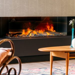 Caminetto 16:9 angolare (dx o sx) elettrico ad acqua, chiuso con vetro, riscaldamento 2 kW, carica acqua automatica (solo con allaccio idraulico), interfaccia utilizzo tramite APP; Illuminazione MULTICOLOR del focolare e del letto di braci; tre possibili rifiniture del focolare: ceppi, ciottoli bianchi, ciottoli vetro.