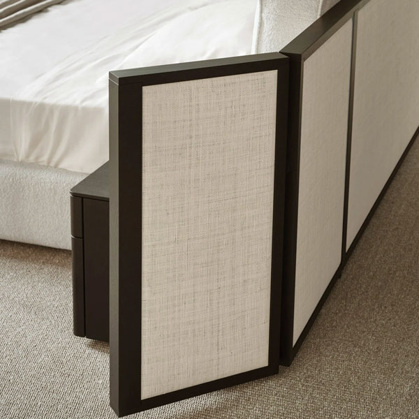 Il paravento è un dettaglio sofisticato di Byron: un telaio in massello di frassino tinto nero racchiude un intreccio in paglia, disponibile in diversi motivi grafici e colori, oppure pannelli in legno in finitura frassino tinto nero. Il letto è disponibile nelle larghezze L.1600 mm, L.1800 mm, nelle profondità 2000 e 2100 mm e nella versione King Size.